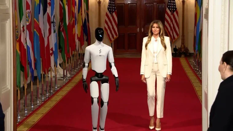 A humanoid robot standing beside Melania Trump at a White House event.